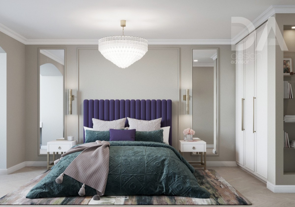 Мы сочетали минималистичные формы мебели, с изящными элементами света и декора, и легкими молдингами на стене.